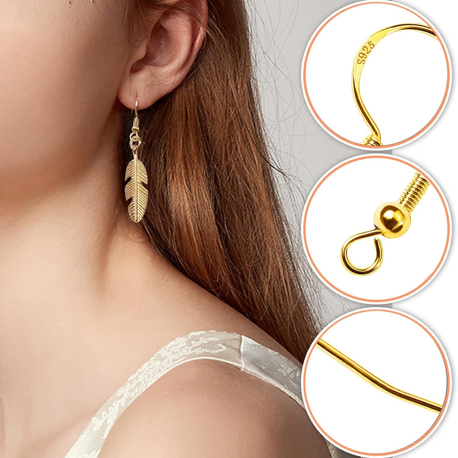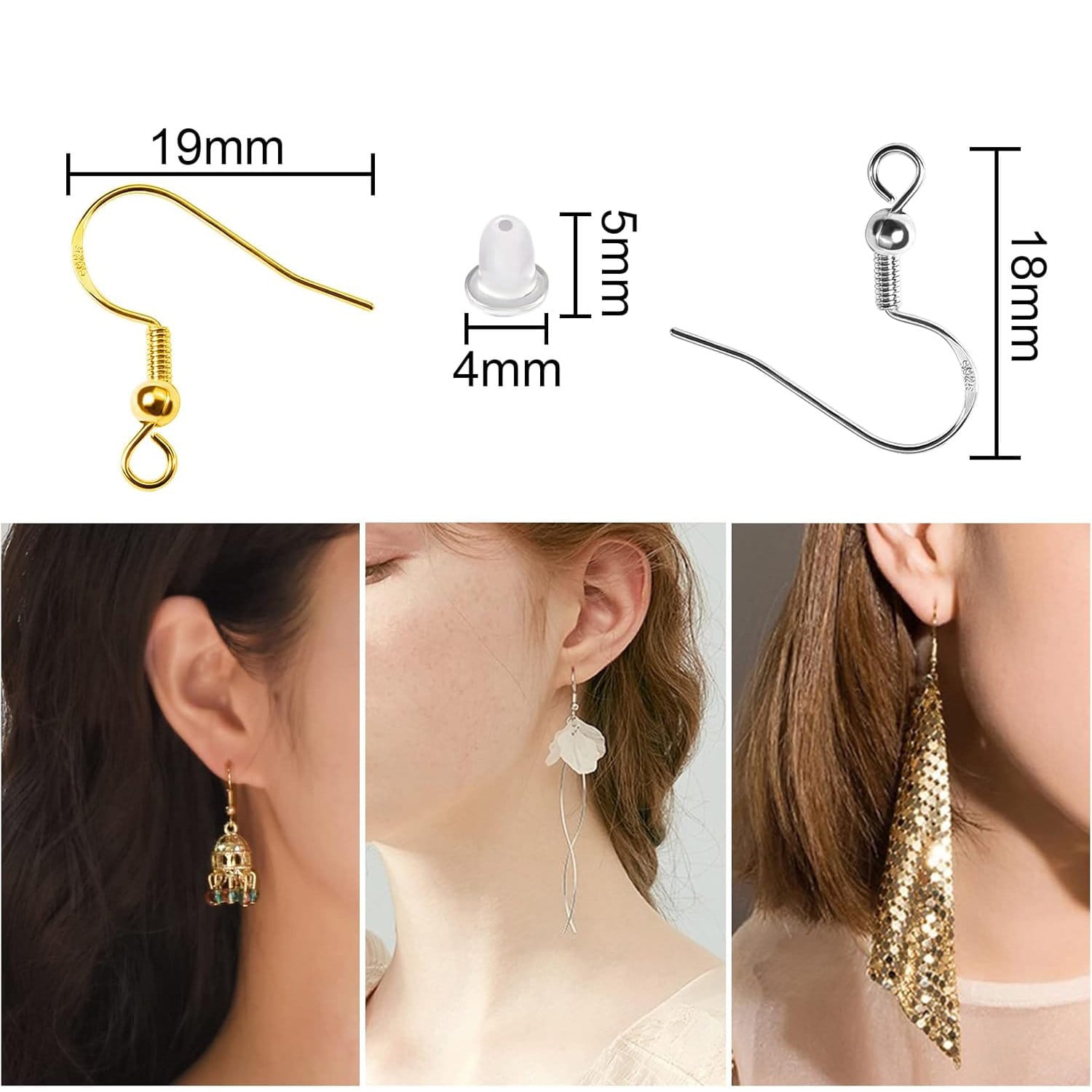 3️⃣ Hipoalergiczne materiały: Haczyki wykonane są z miedzi pokrytej srebrem 925, dzięki czemu są delikatne dla skóry i bezpieczne dla osób o wrażliwych uszach. Silikonowe zatyczki zapewniają komfort i stabilność noszenia.