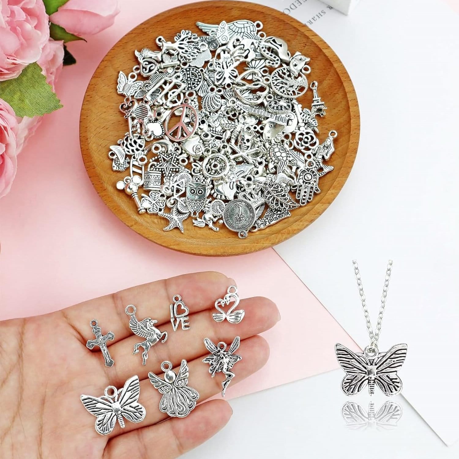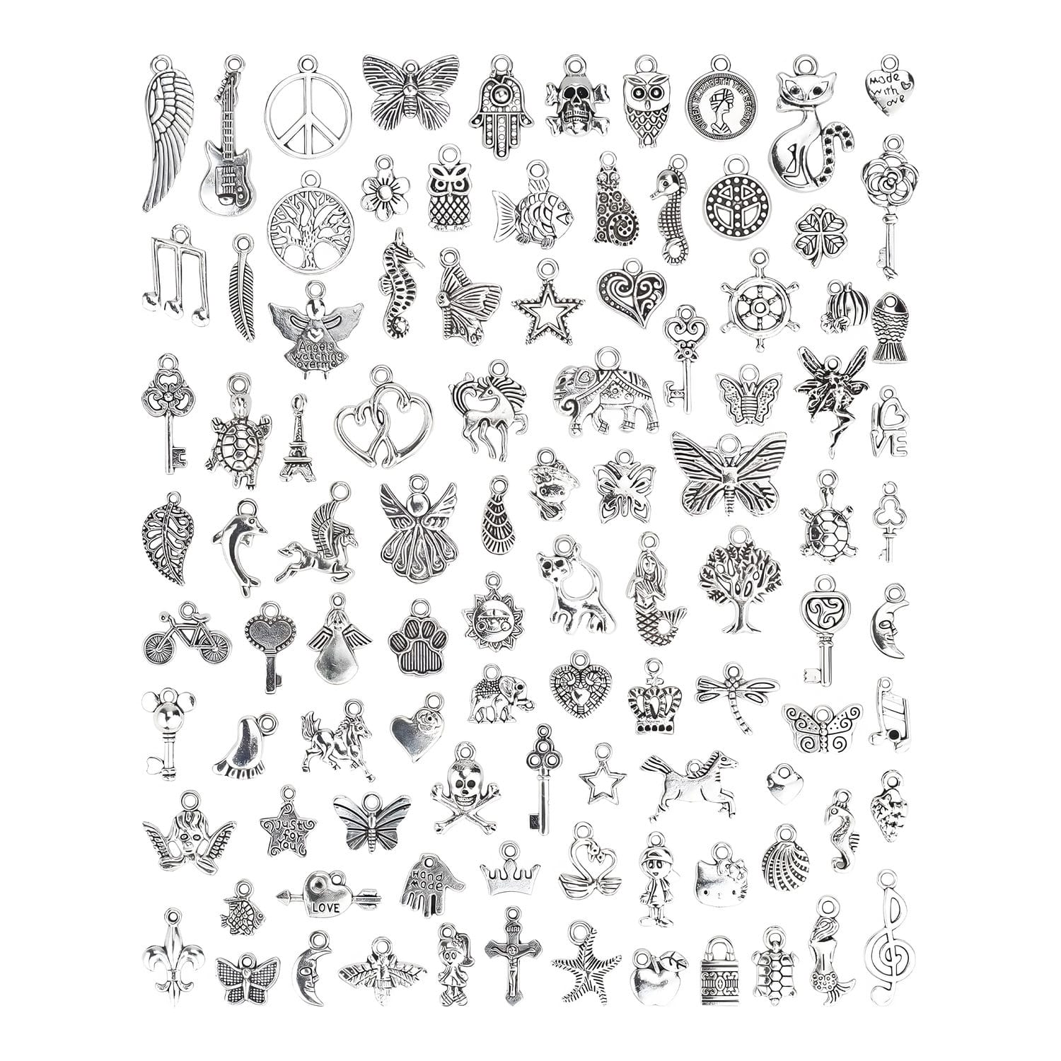 Uniwersalny zestaw 100 zawieszek: Ten komplet zawiera aż 100 metalowych charmsów w klasycznym stylu tybetańskiego srebra. Idealny dla osób tworzących biżuterię, ozdoby lub projekty scrapbookingowe.
