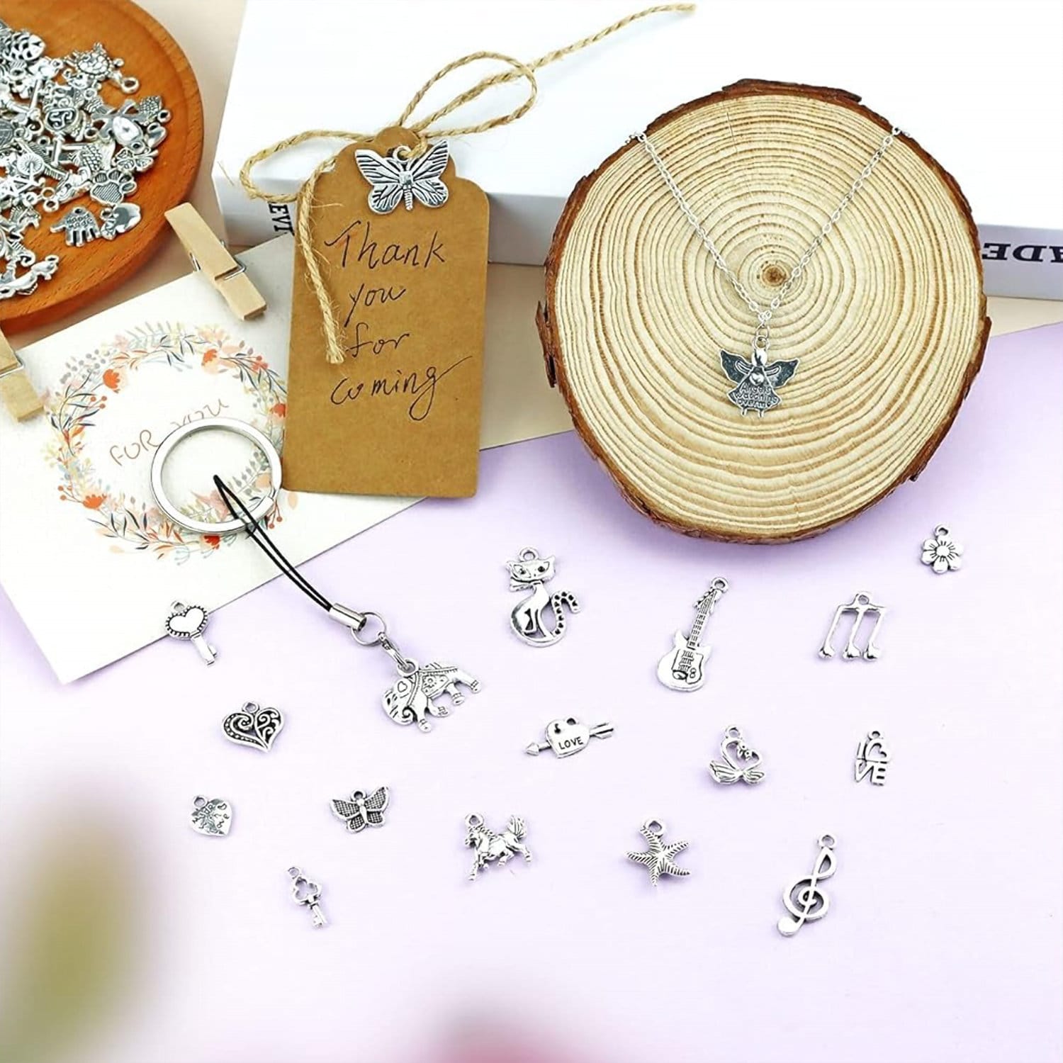 Różnorodne wzory: W zestawie znajdują się zawieszki o wielu kształtach i motywach – od kwiatów i zwierząt po gwiazdy, serca czy klucze. Dzięki temu każdy projekt może być unikalny i dopasowany do okazji.