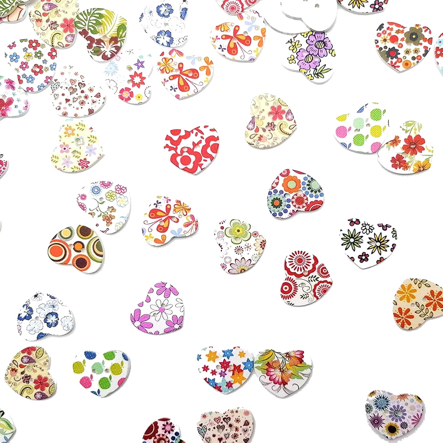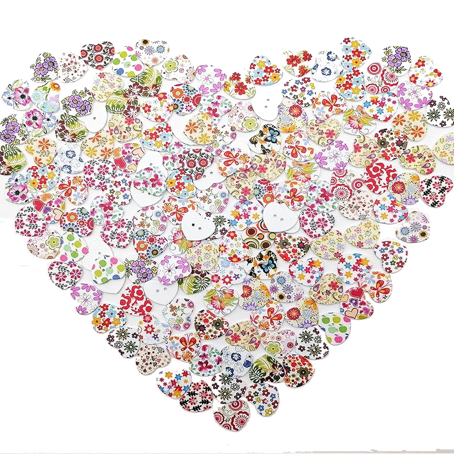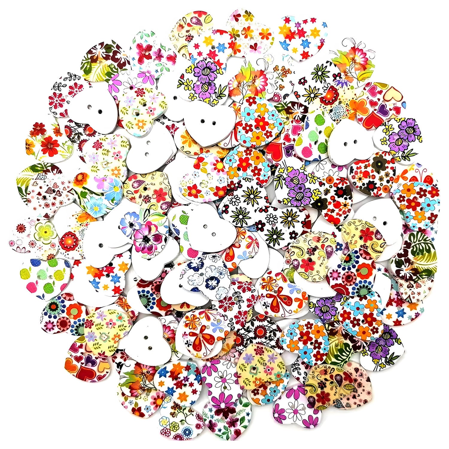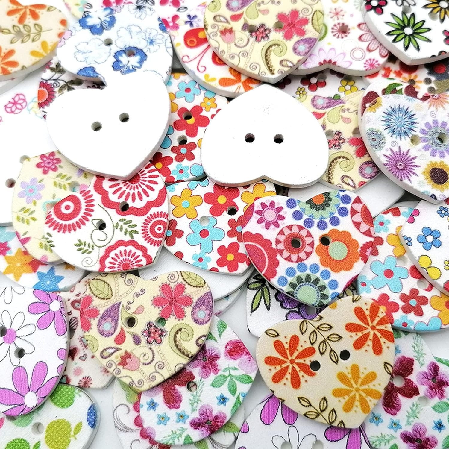 Zestaw zawiera 100 drewnianych guzików w kształcie serca, ozdobionych kolorowymi wzorami kwiatowymi. Każdy guzik ma gładką powierzchnię, jest trwały, odporny na ścieranie i świetnie sprawdza się w wielu projektach rękodzielniczych.