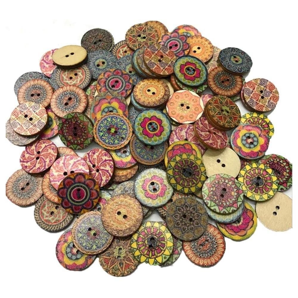 Naturalne drewno z kolorowym wzorem: Każdy guzik jest wykonany z drewna i ozdobiony wzorem w stylu retro, co nadaje ciepły, klasyczny charakter Twoim projektom.