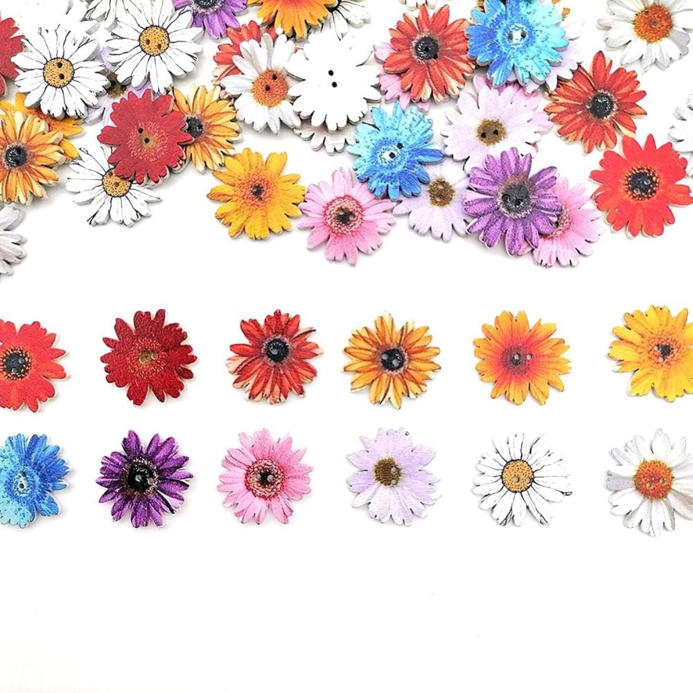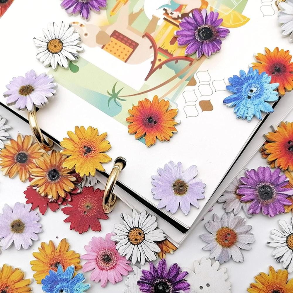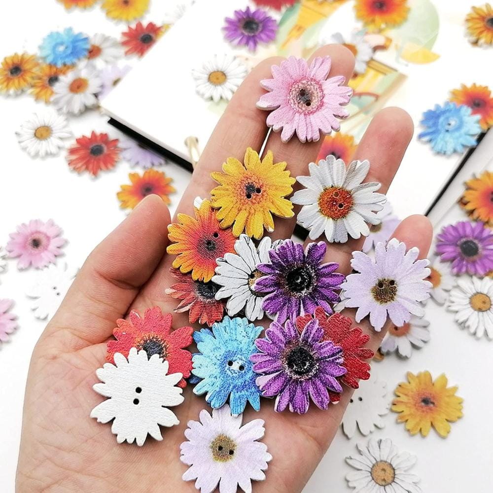 Zestaw 100 drewnianych guzików kwiatów: Otrzymujesz aż 100 kolorowych guzików w kształcie stokrotek – idealnych do różnych zastosowań dekoracyjnych i krawieckich.