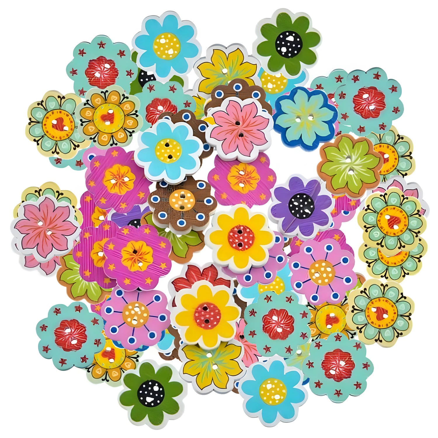Kolorowe, drewniane guziki w kształcie kwiatów to doskonały dodatek do projektów rękodzielniczych. W zestawie znajduje się 50 sztuk guzików o średnicy 20 mm, każdy z unikalnym wzorem i barwną stylistyką. Sprawdzą się w szyciu, scrapbookingu, zdobieniu kartek czy przy ozdabianiu ubrań i dodatków.