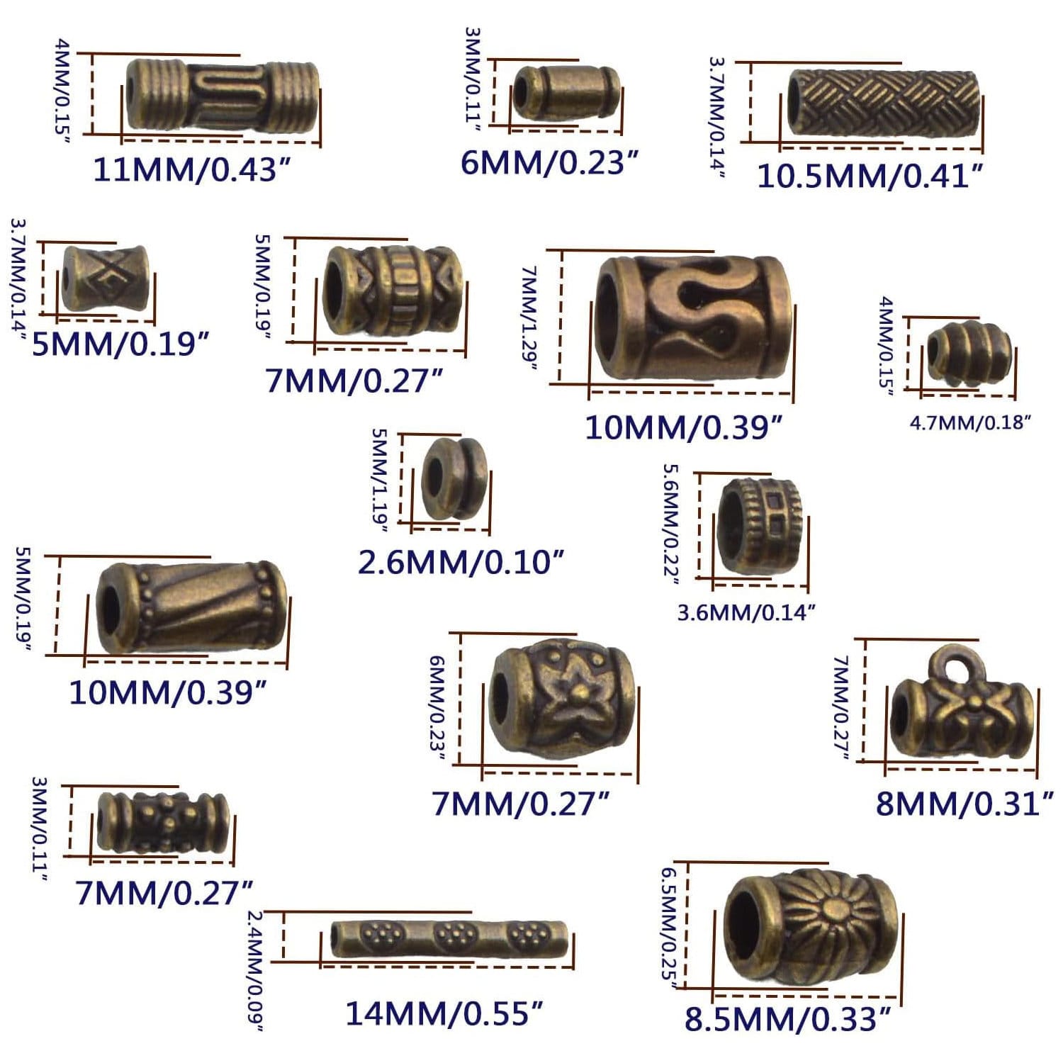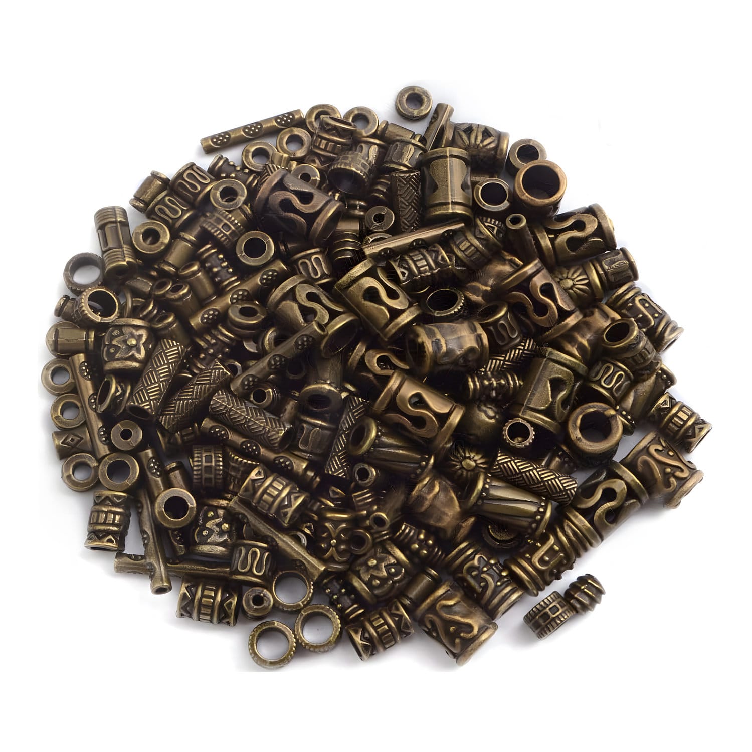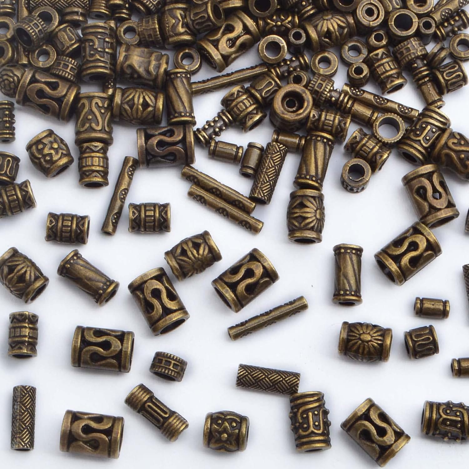 Zestaw metalowych koralików w stylu retro, idealnych do tworzenia biżuterii i dekoracji DIY. Dzięki różnorodnym kształtom – kolumnowym, beczułkowatym i rurowym – koraliki świetnie sprawdzą się w bransoletkach, naszyjnikach, kolczykach czy zawieszkach.