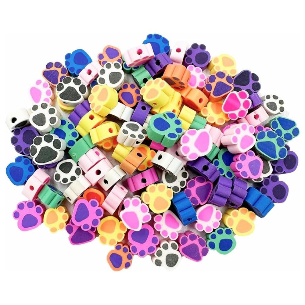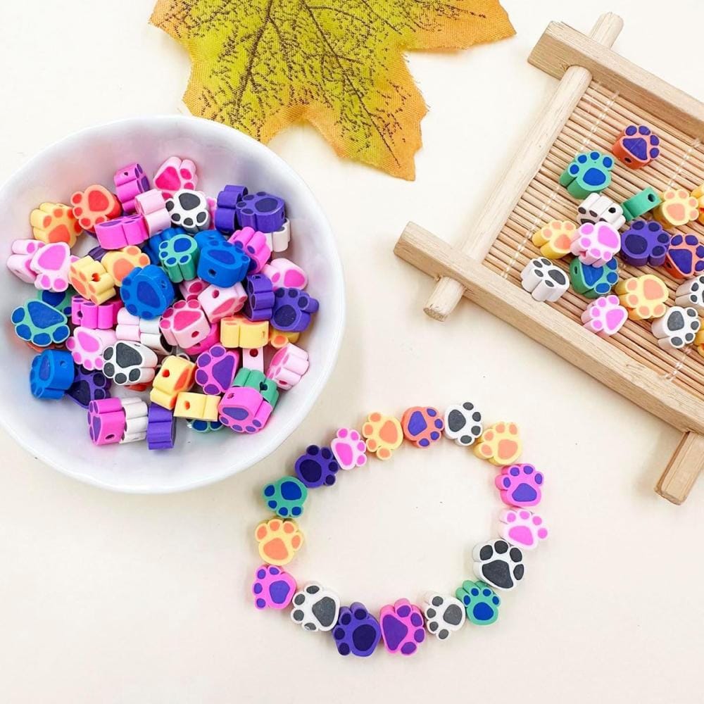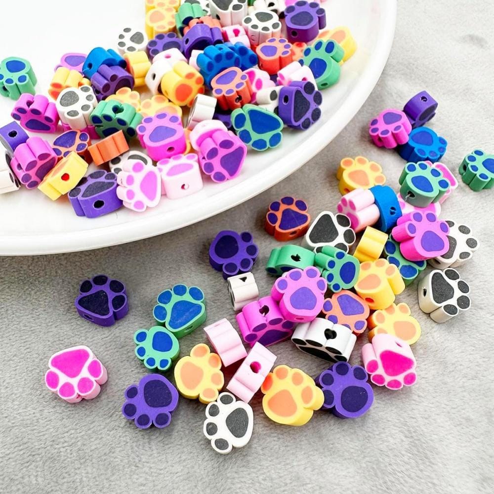 Zestaw 100 sztuk koralików z glinki polimerowej w kształcie łapek misia. Koraliki mają różnorodne kolory, są lekkie i przyjemne w dotyku, co czyni je idealnymi do bransoletek, naszyjników, spinek do włosów czy dekoracji DIY.