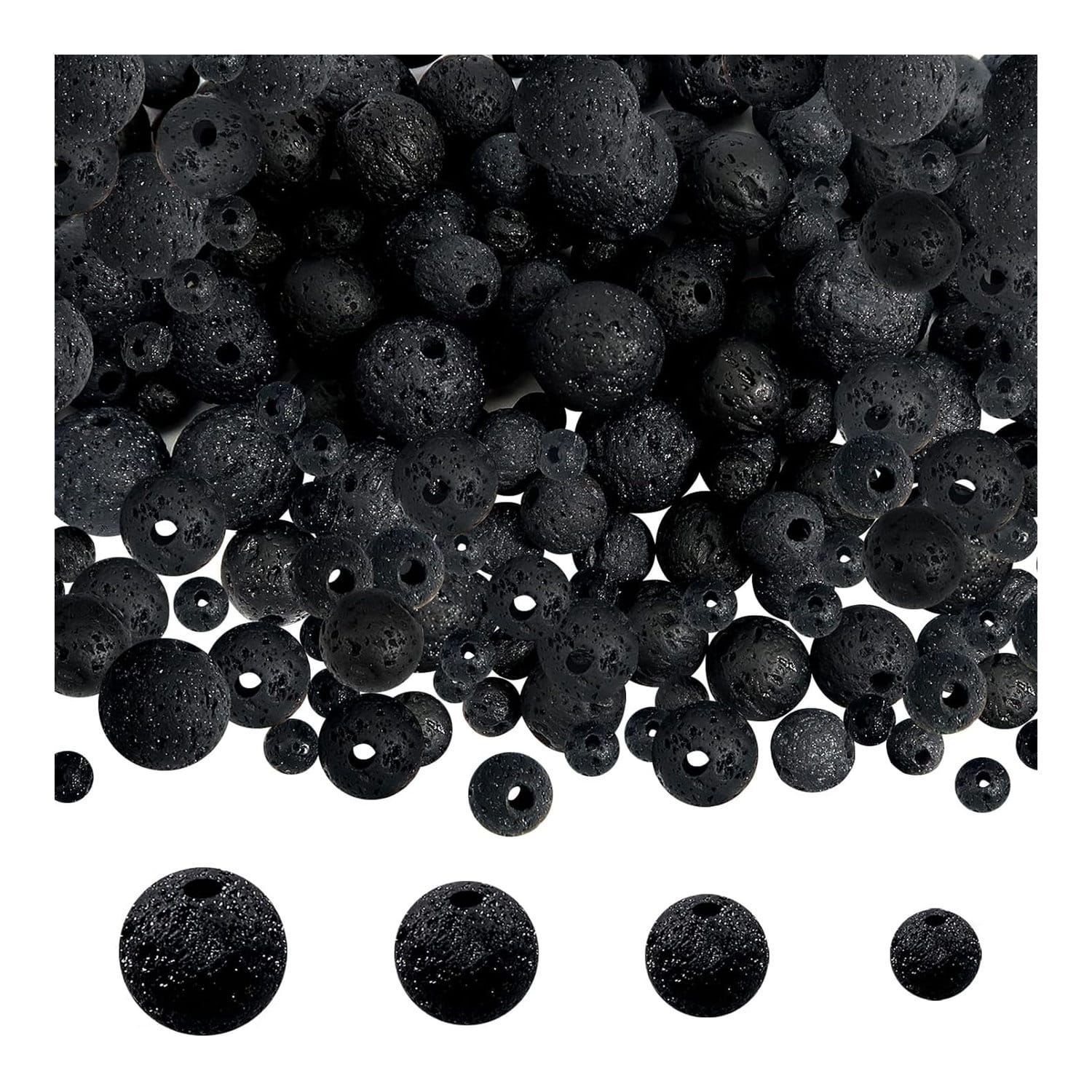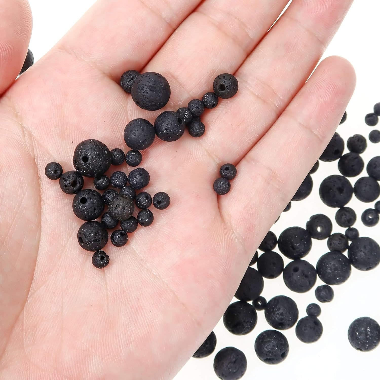 Zestaw koralików wykonanych z naturalnej skały wulkanicznej w czarnym kolorze. Charakteryzują się porowatą strukturą, lekką wagą i niepowtarzalnym wyglądem. Idealne do tworzenia biżuterii, dekoracji domowych i aromaterapii – mogą służyć jako naturalne dyfuzory olejków eterycznych.