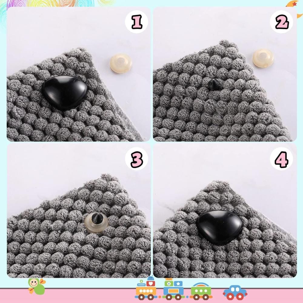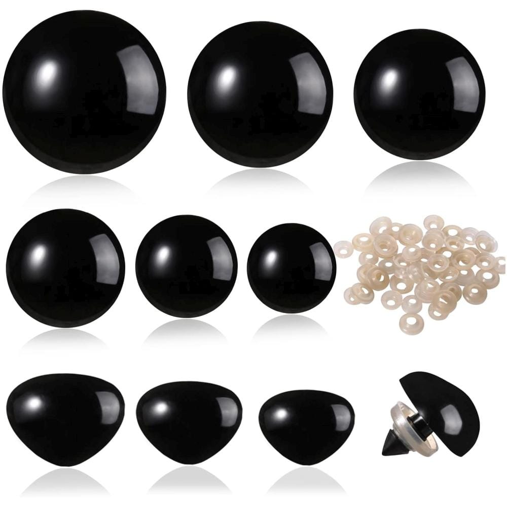 Zestaw dużych oczek do zabawek. Zawiera ich różne rozmiary oraz podkładki zabezpieczające. Jest przeznaczony do tworzenia lalek, misiów i innych zabawek, zapewniając trwałe i bezpieczne elementy do projektów rękodzielniczych.