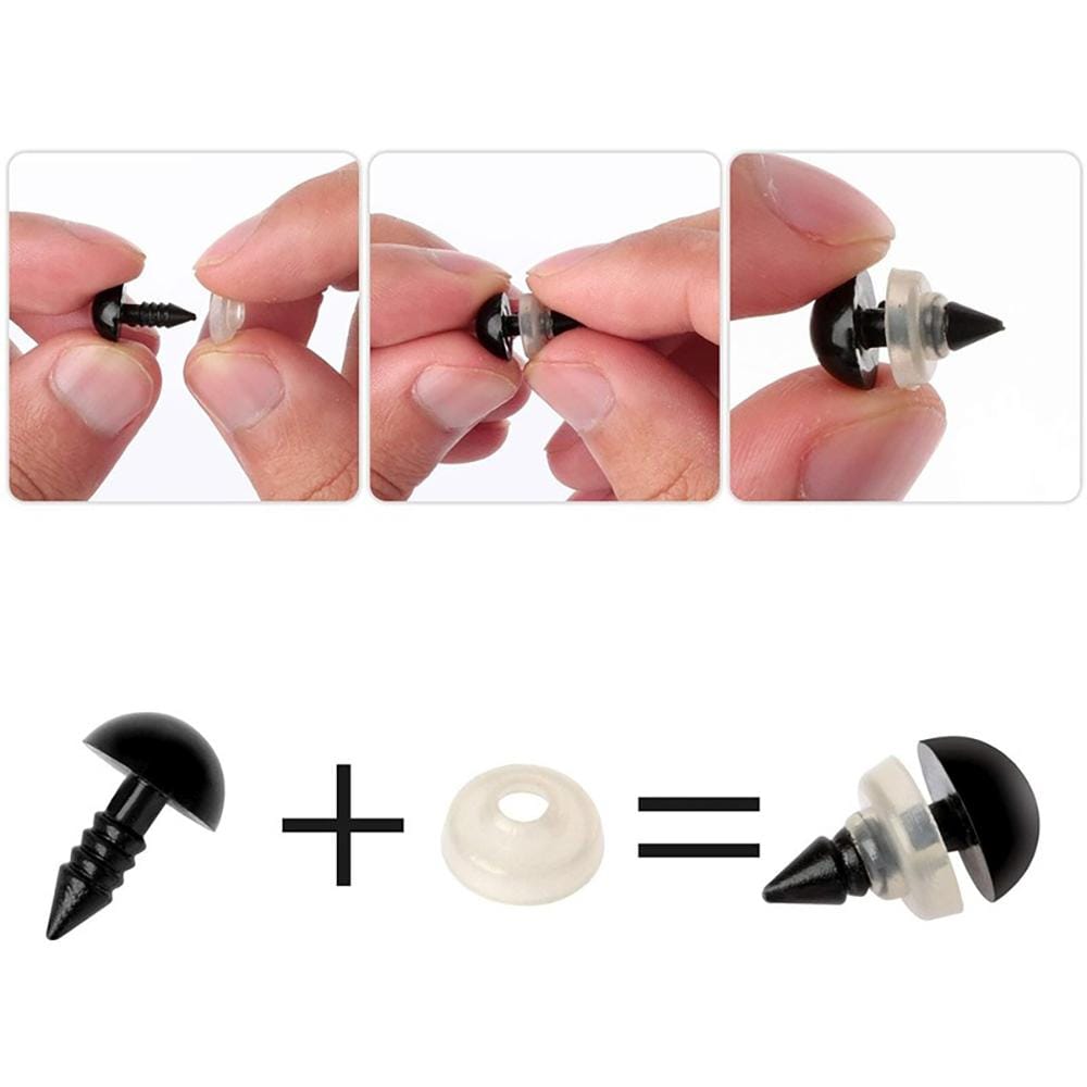 5 rozmiarów oczek: Oczka w rozmiarach od 6 do 12 mm pozwalają na elastyczne dopasowanie do wielkości tworzonej postaci. Czarna, błyszcząca powierzchnia nadaje im realistyczny wygląd.