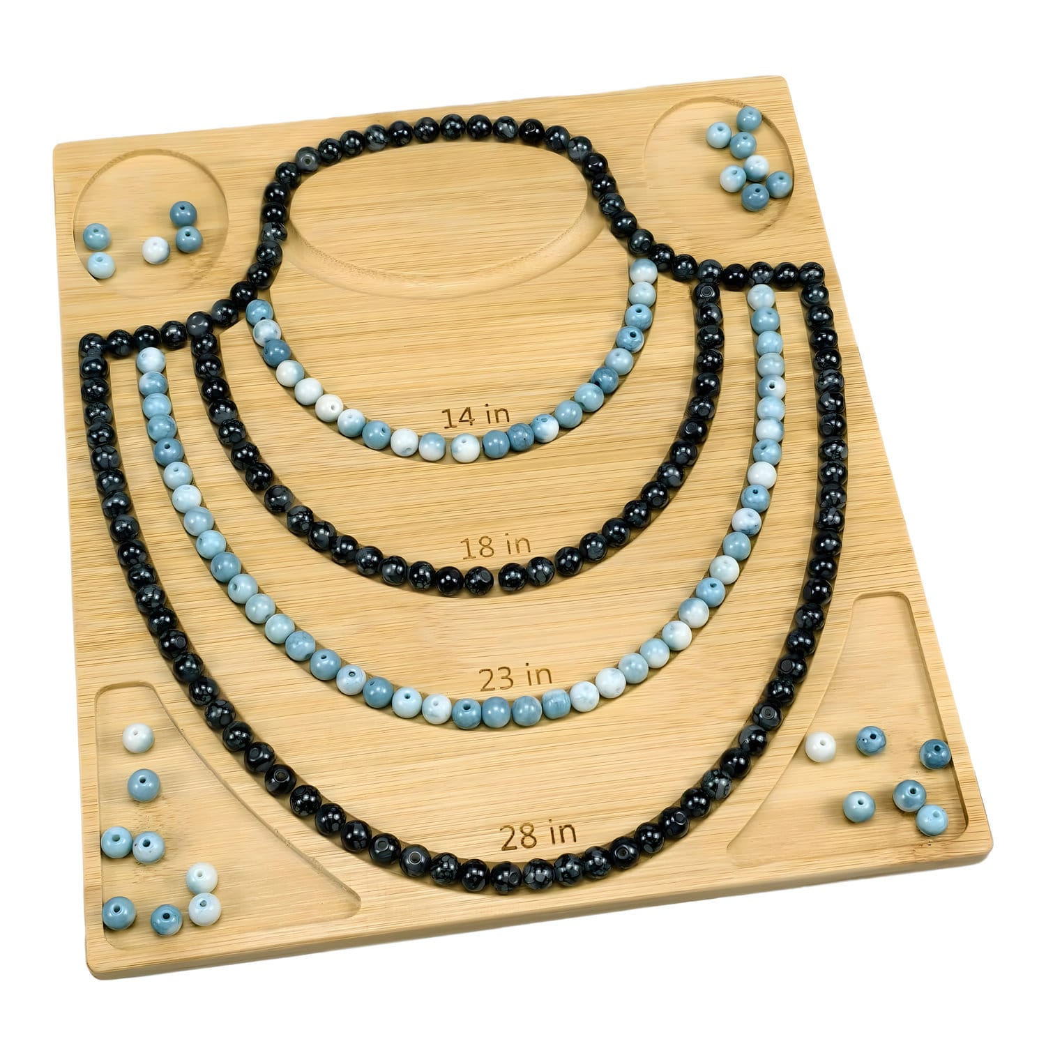Wielofunkcyjna powierzchnia robocza: 4 rowki umożliwiają projektowanie naszyjników o długości od 35 do 70 cm, a dodatkowe przegrody pozwalają uporządkować koraliki i akcesoria, by zawsze były pod ręką.