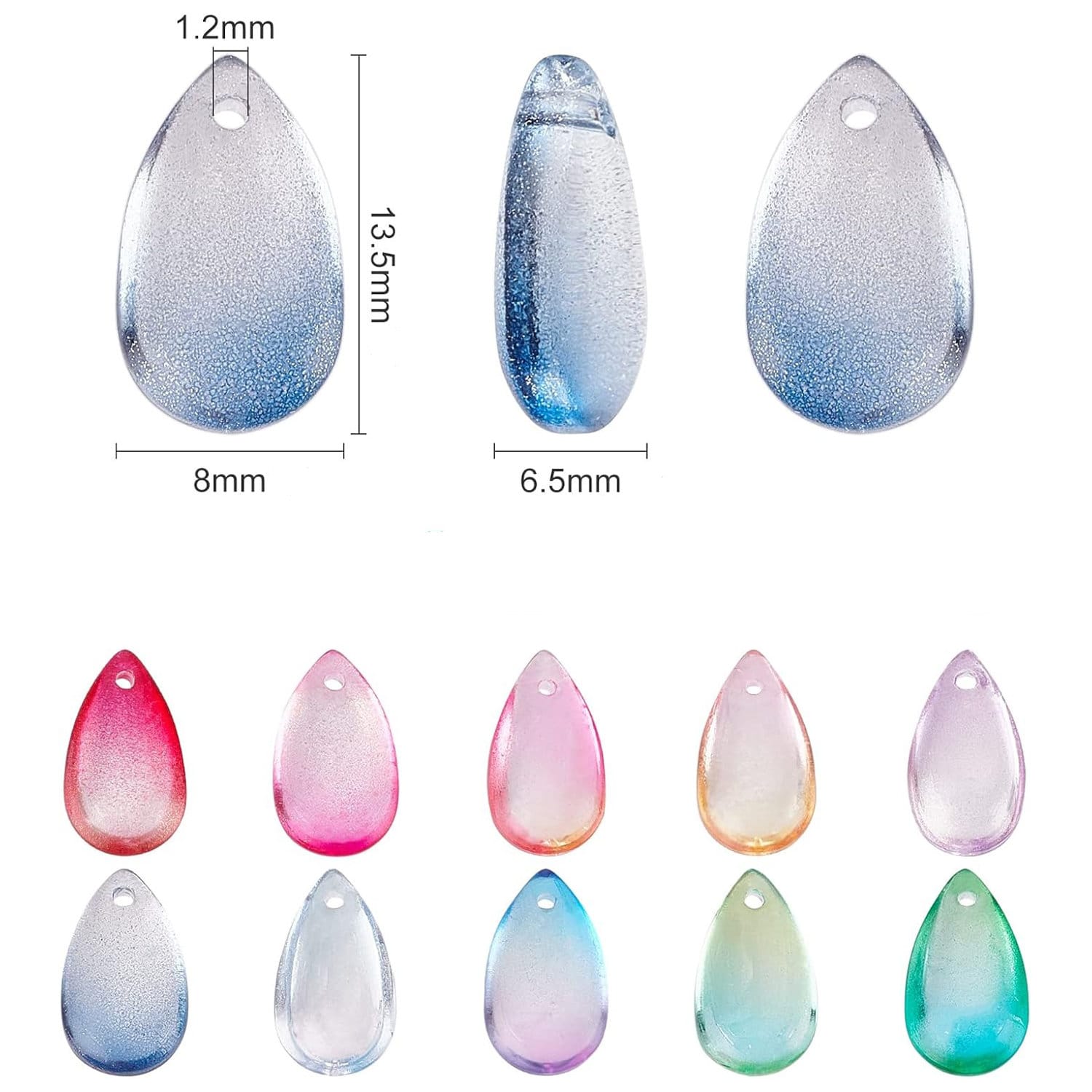 Zestaw koralików w kształcie łezki, wykonanych ze szkła o wysokiej przejrzystości. Każdy koralik ma gładką powierzchnię i połyskuje. Różnorodność kolorów i błyszczące wykończenie sprawiają, że idealnie nadają się do tworzenia biżuterii, ozdób i dekoracji.