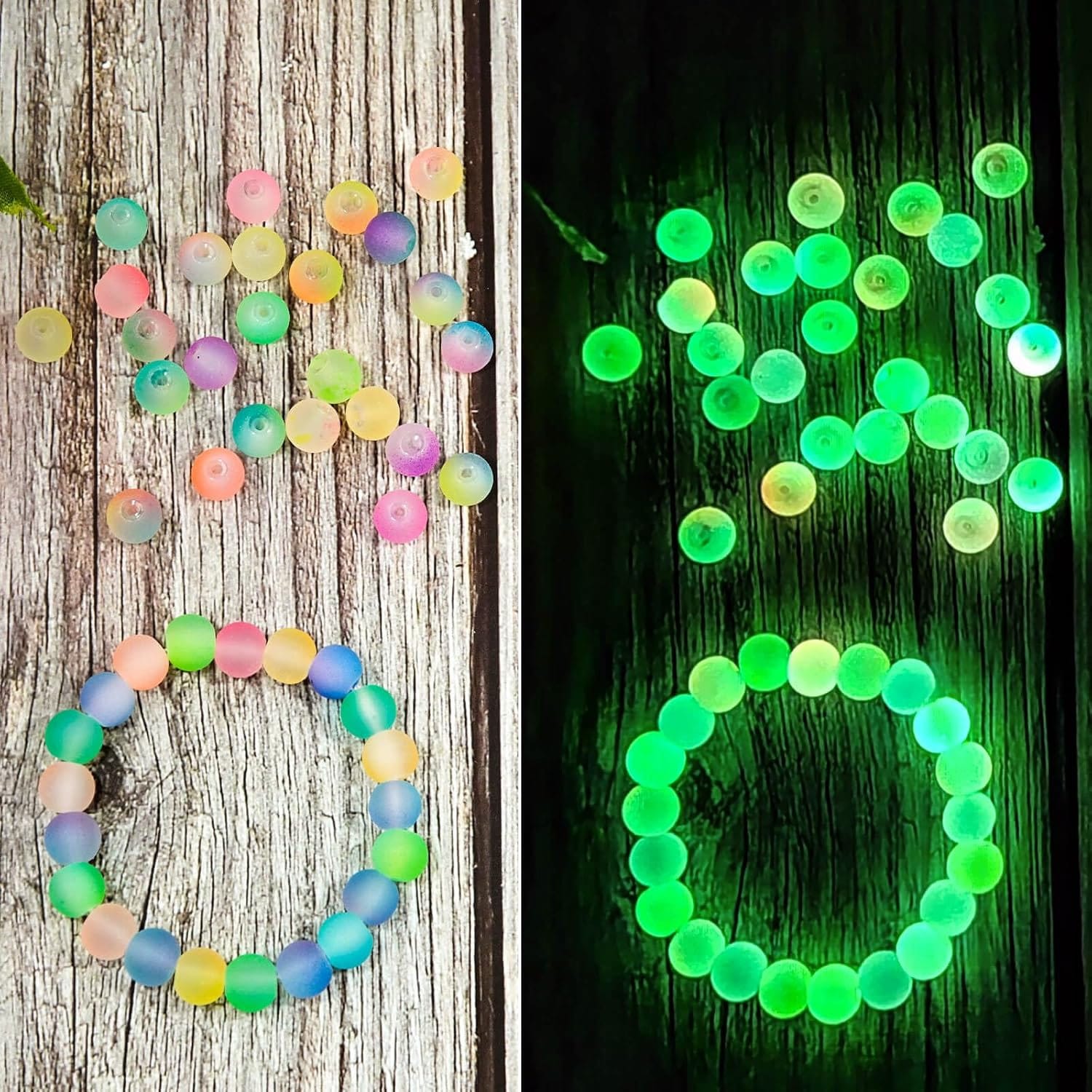 Świecące w ciemności: Koraliki wykonane ze szkła z powłoką luminescencyjną, która po naświetleniu (ok. 10 minut w świetle dziennym lub lampce) świeci w ciemności, tworząc niezwykły efekt świetlny w Twoich projektach.