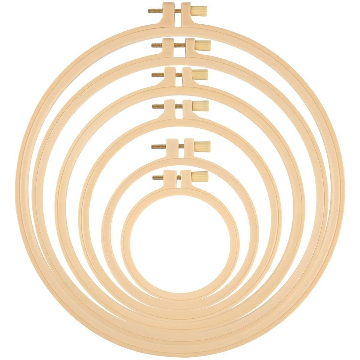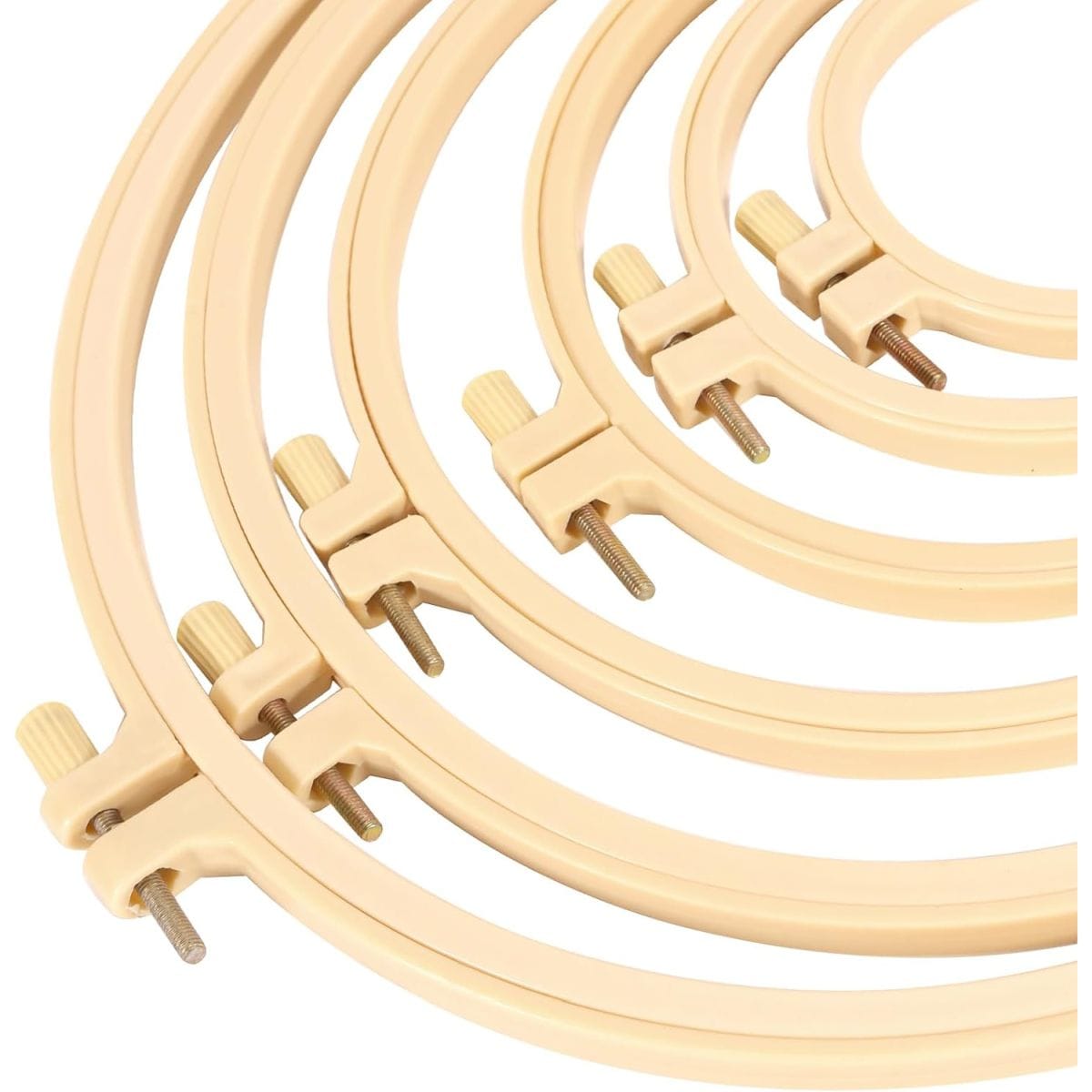 Zestaw 6 tamborków do haftowania wykonanych z tworzywa sztucznego. Zamykane poprzez dokręcanie metalowej śruby. Zostały wykonane z wysoką starannością, nie posiadają ostrych krawędzi. Dostępne w aż 6 różnych rozmiarach.