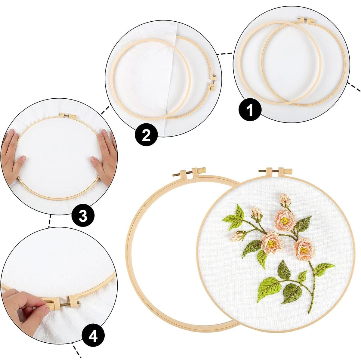 Przed użyciem odkręcamy śrubę i demontujemy jedną obręcz od drugiej. Następnie na obręcz o mniejszej średnicy nakładamy materiał i przykrywamy go zewnętrzną obręczą. Teraz wystarczy naciągać materiał stopniowo dokręcając śrubę tamborka.