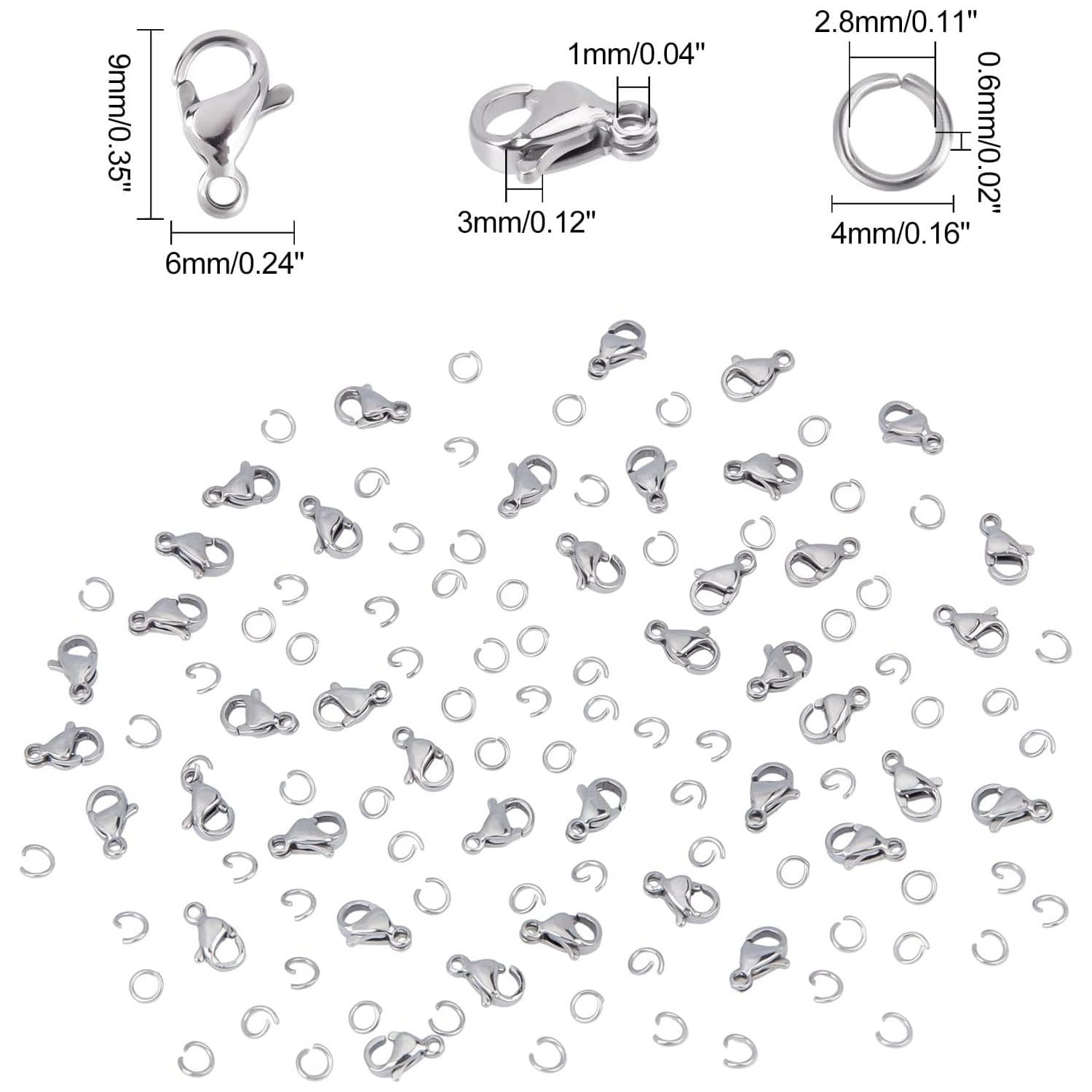 Praktyczny komplet do tworzenia i naprawy biżuterii, zawierający karabińczyki oraz kółka montażowe wykonane z trwałej stali nierdzewnej 304. Materiał ten jest odporny na rdzę, nie odbarwia się i zachowuje połysk przez długi czas.