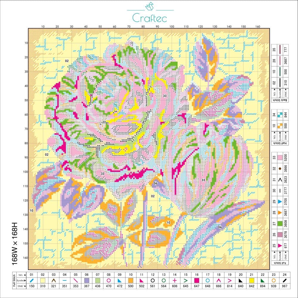 Czytelny nadruk – wzór jest kolorowy i podzielony siatką, a każdy ścieg oznaczony symbolem. Dzięki temu łatwo odczytasz, jaki kolor i rodzaj ściegu należy zastosować.