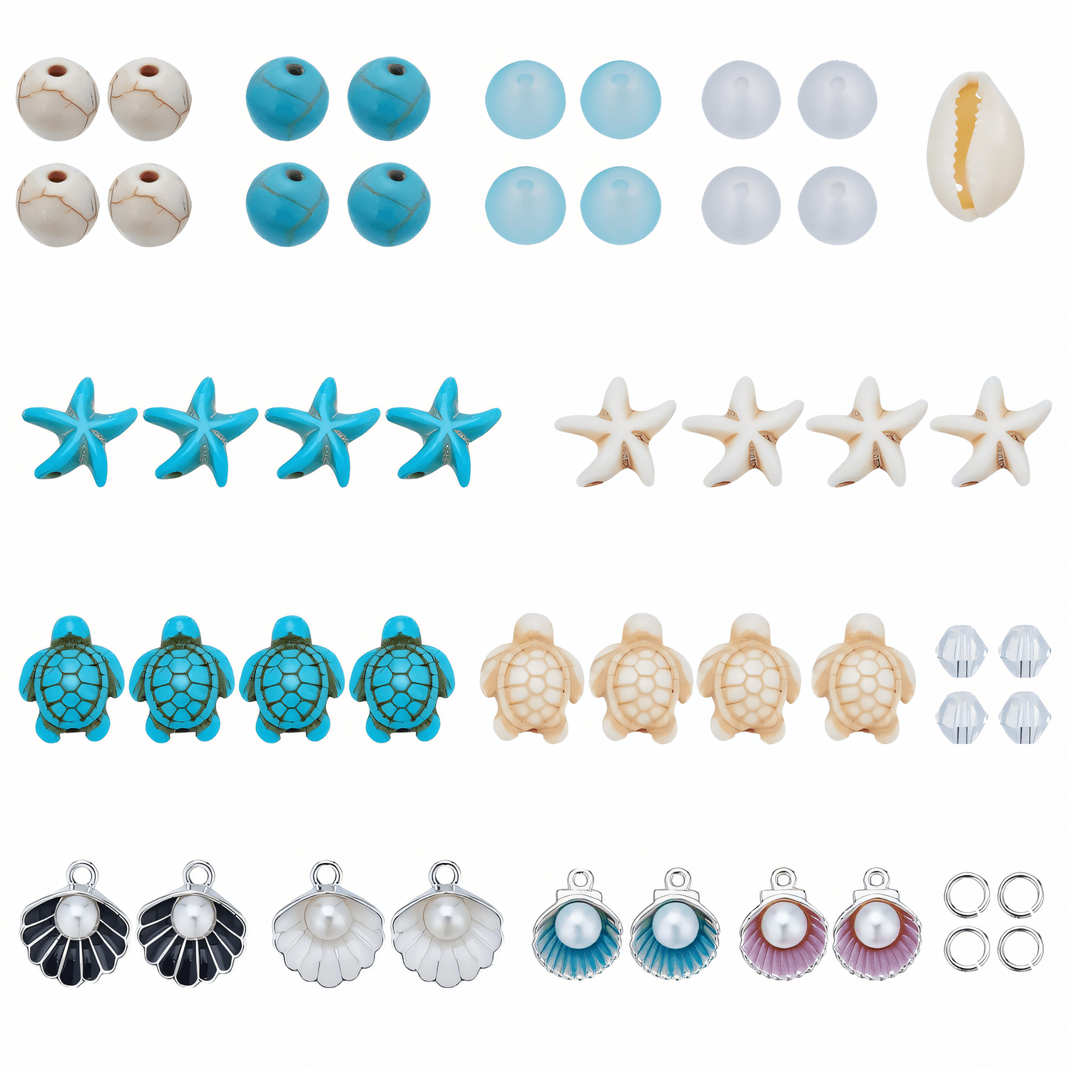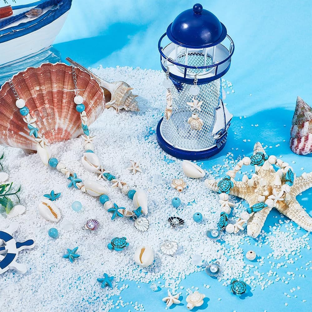 Zestaw koralików i zawieszek inspirowanych motywami morskimi to idealna propozycja do tworzenia letniej biżuterii. Zawiera różnorodne elementy, takie jak żółwie, rozgwiazdy, muszle i kolorowe koraliki, które można łatwo łączyć ze sobą.