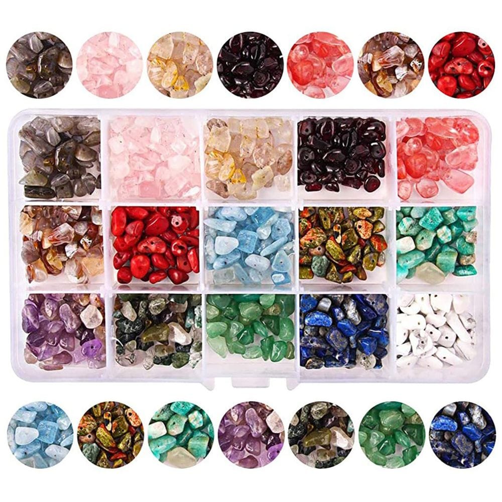 • 15 RODZAJÓW NATURALNYCH KAMIENI: Zestaw zawiera 15 różnych kamieni półszlachetnych, w tym akwamaryn, kwarc różowy, ametyst, lapis lazuli i wiele innych. Idealne do tworzenia unikalnych projektów DIY.