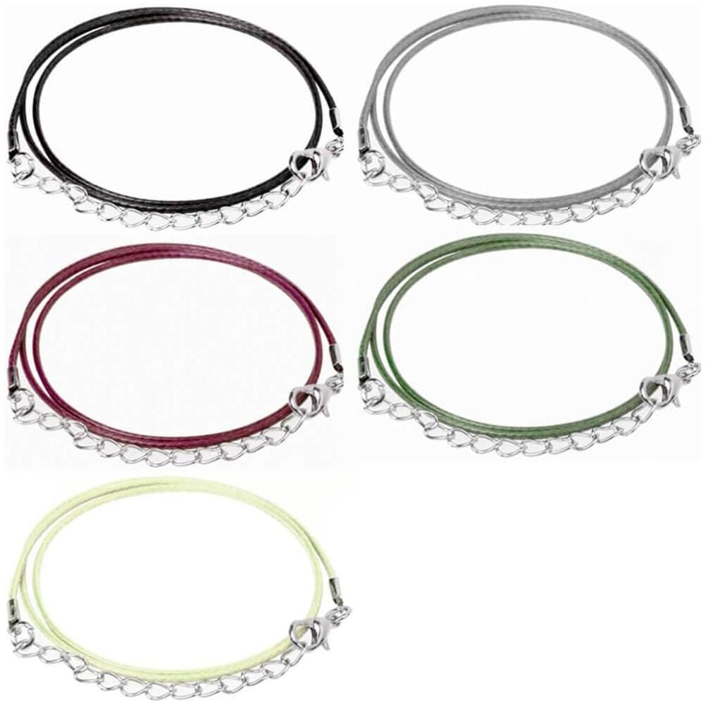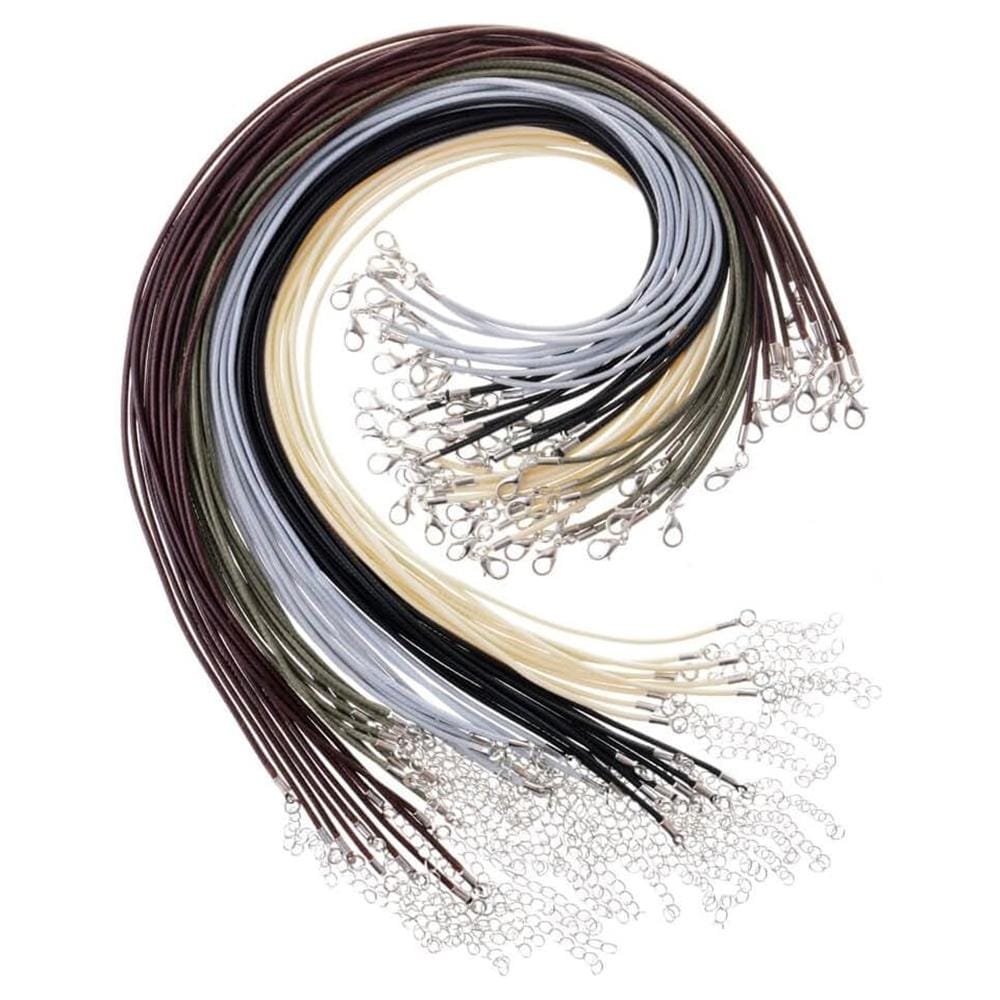 Zestaw 50 gotowych sznurków do naszyjników z zapięciem, wykonanych z bawełny woskowanej, idealnych do tworzenia biżuterii. Dostępne w pięciu stonowanych kolorach, z regulacją długości dzięki łańcuszkowi przedłużającemu.