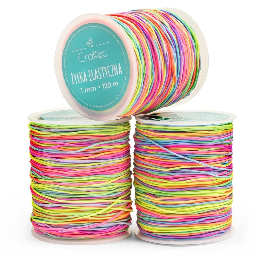Żyłka do robienia bransoletek o długości 120 metrów w tęczowych kolorach. Idealna do nawlekania koralików i innych projektów DIY. Wykonana z poliestru i plecionej gumy. Jest trwała, elastyczna i łatwa do cięcia oraz wiązania.